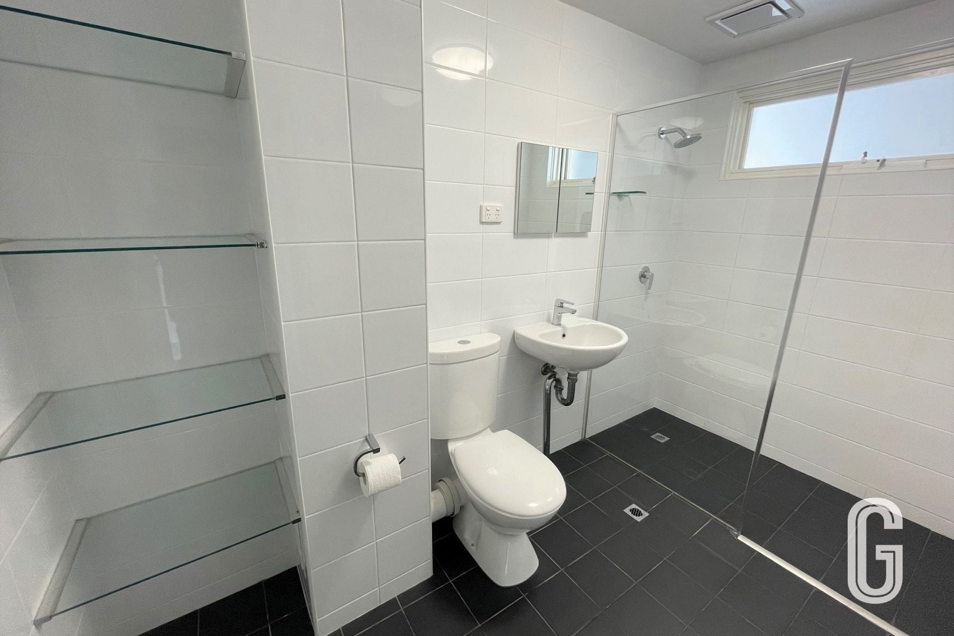 - Modern bathroom with additional shelving