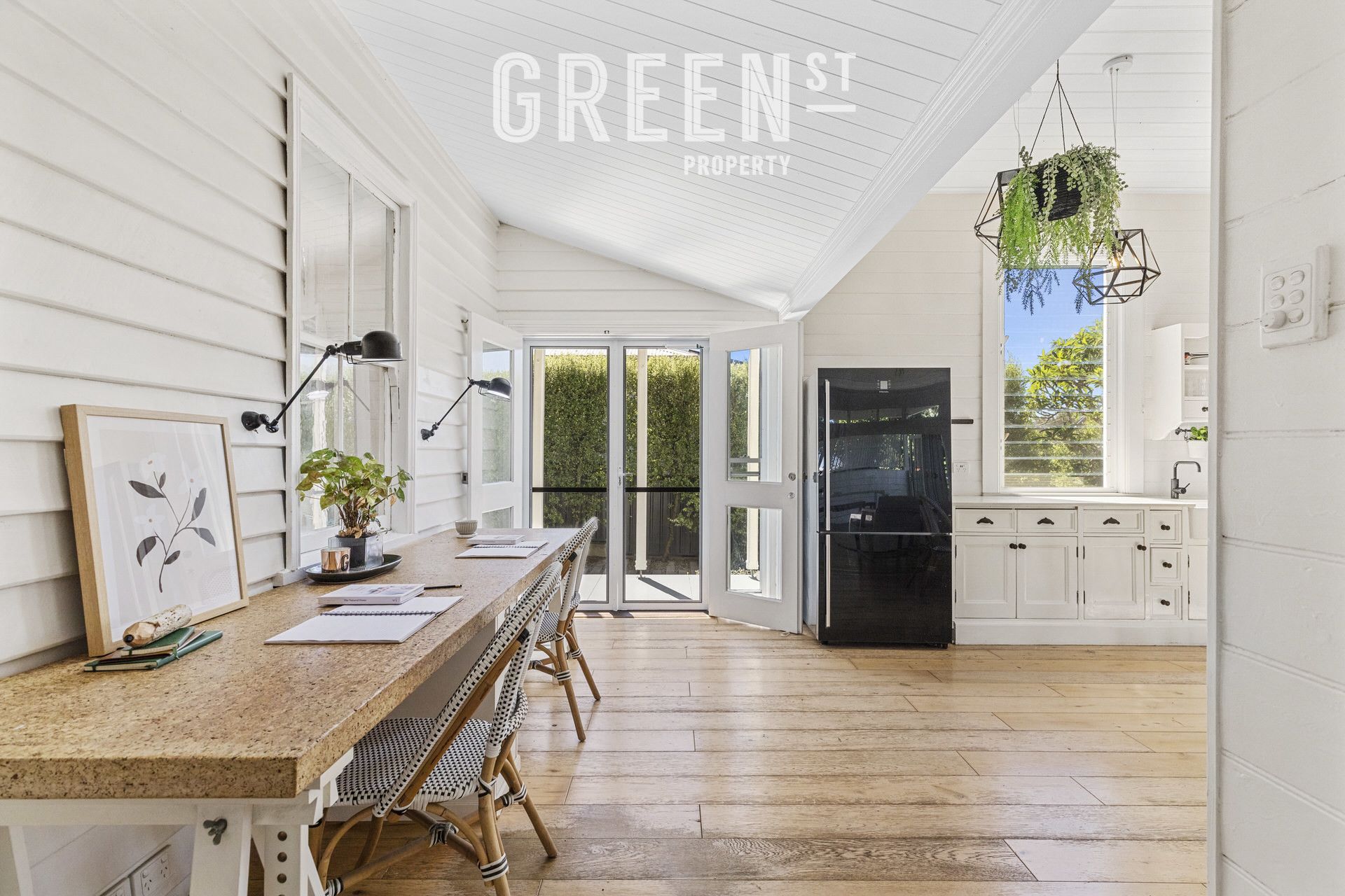 The country-style kitchen sits at the centre of the home, flowing to both the lounge and outdoor entertaining areas - a sun-drenched deck to one side, and a paved courtyard and kitchen garden to the other. High ceilings, hardwood floors and timber wall linings frame the home's warm character, while thoughtful updates deliver ease for contemporary living.